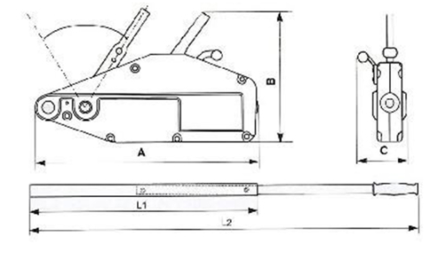 | 型號(hào) | 額定載荷 | 額定載荷時(shí)手拉力 | 額定載荷時(shí)手柄往復(fù)一次鋼絲繩行程 | 鋼絲繩直徑 | 葫蘆重量 | 外形尺寸 |